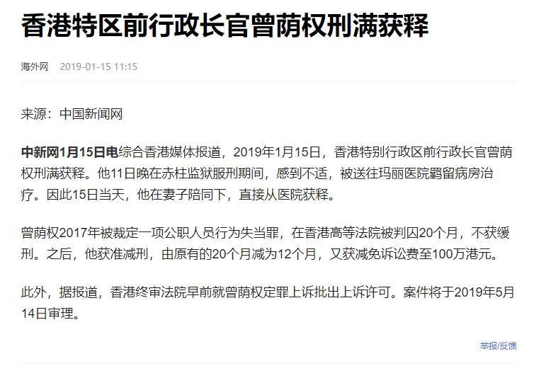 2017年曾荫权被判公职人员行为失当罪,判处入狱20个月,后减刑至12个月,2019年1月15日刑满出狱,2019年6月26日,香港终审法院判决曾荫权的“公职人员行为失当定罪”获撤销。