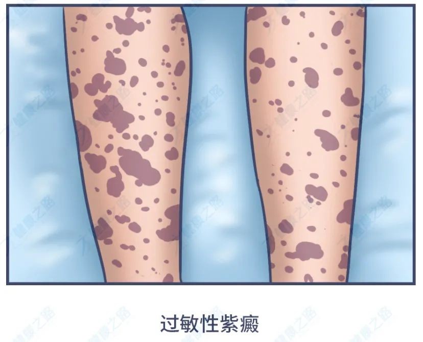 这种紫红色的红点(红斑)经常在小腿(下肢、臀部)处密集出现,是因为血管发炎出现的症状。