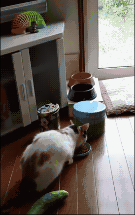 猫咪走路或者发呆的时候,一回头被主人悄悄放在背后的黄瓜吓得跳了起来,浑身都炸毛了,然后迅速逃走。