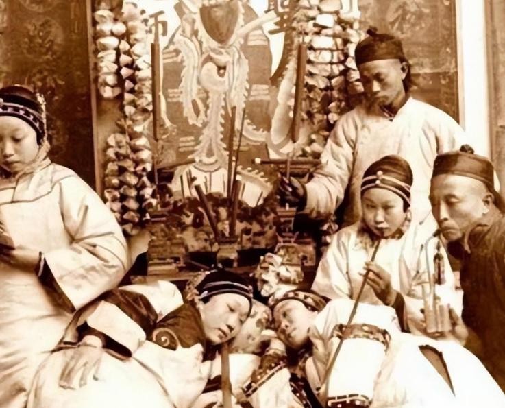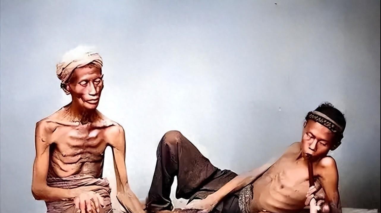 清朝的两个长期吸食鸦片的男子,骨瘦如柴,面色苍白,双目无神