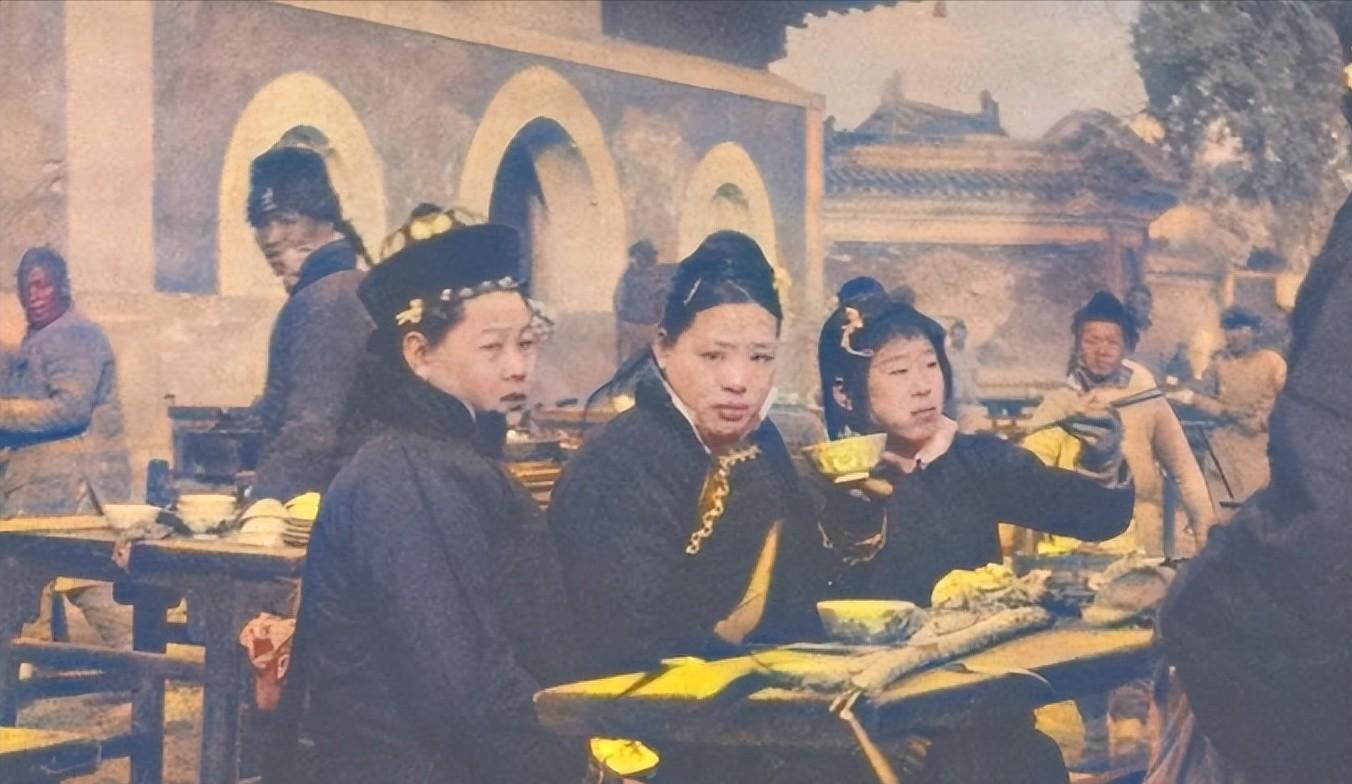 清代女性聚集吃宴席,婀娜多姿,妆饰华丽。