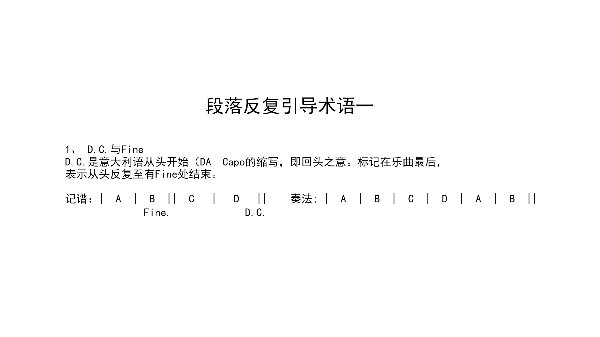 D.C.是意大利语从头开始(DA Capo的缩写,即回头之意。标记在乐曲最后,表示从头反复至有Fine处结束。