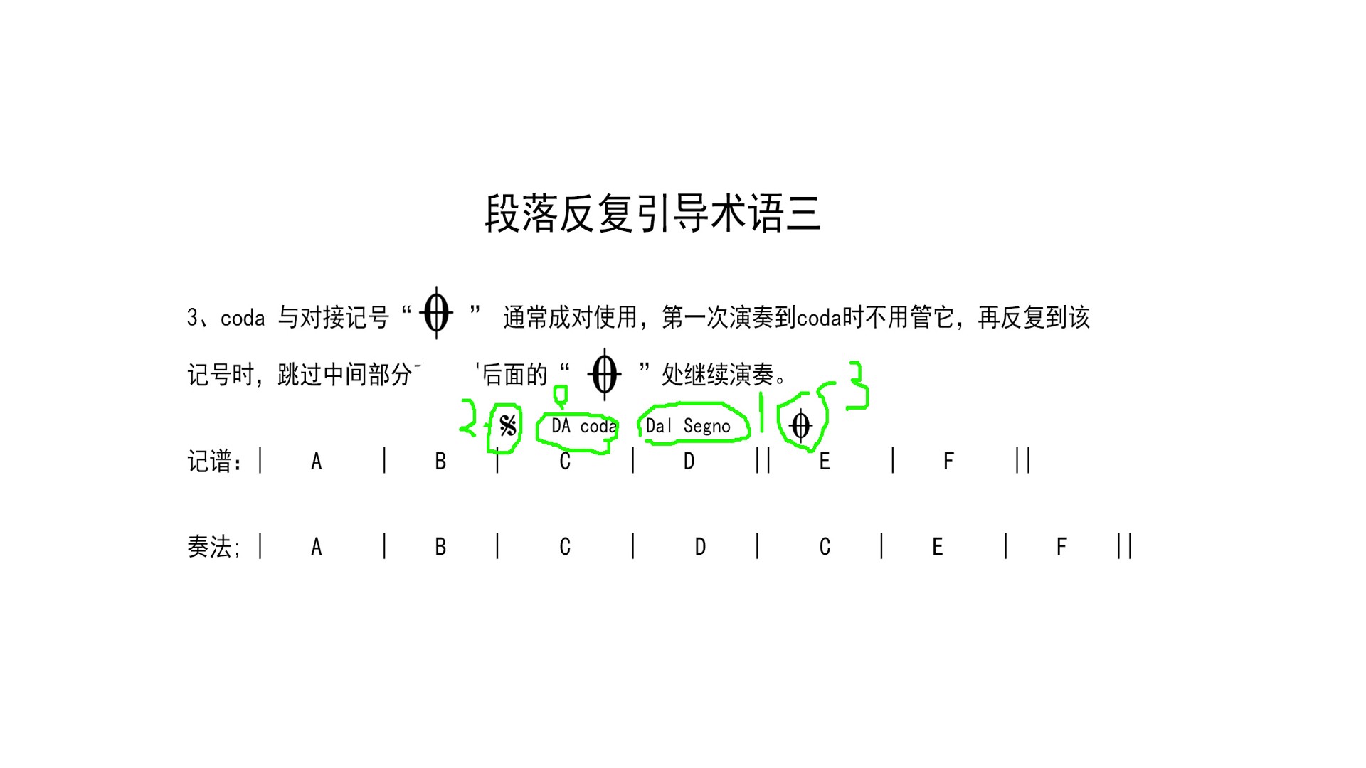 这段乐谱里面有一对和上面讲的一样,可参考上面说法。它们通常各自成对使用。下面乐谱演奏说明:第一次演奏到“下图绿字0(Da coda )”时不用管它,一直演奏到“下图绿字1(Dal Segno)”时 从“2(S重叠%号)” 开始然后重复到“ 下图绿字1(Da coda )”记号时,跳过中间部分直接演奏后面“ 绿字3(瞄准一样的图标) ”处继续。