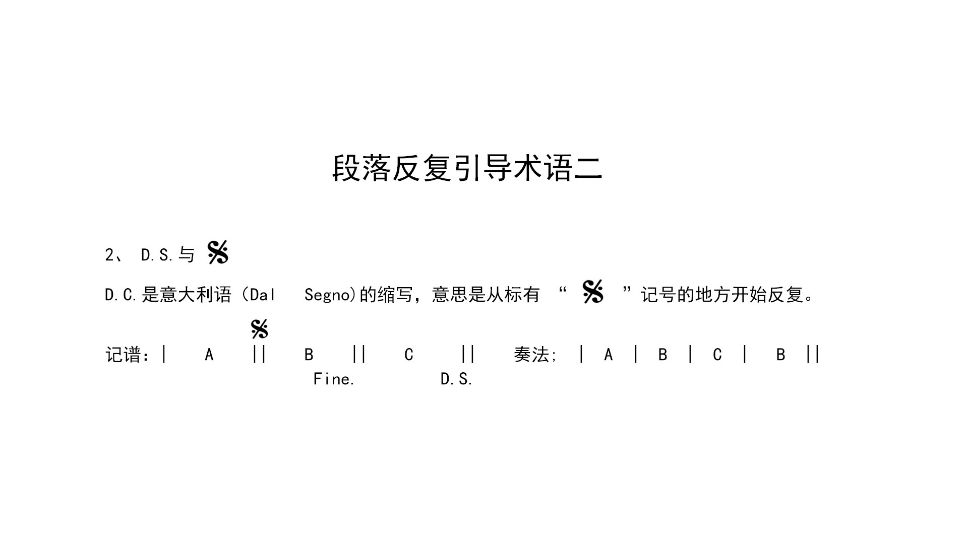D.C.是意大利语(Dal Segno)的缩写,意思是从标有 “ (S重叠%号)”记号的地方开始反复。(如下图所示)