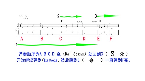 就是弹奏ABC到有D.S.标志时。跳到“ (S重叠%号)”地方。弹奏B。最后看到Fine就结束。