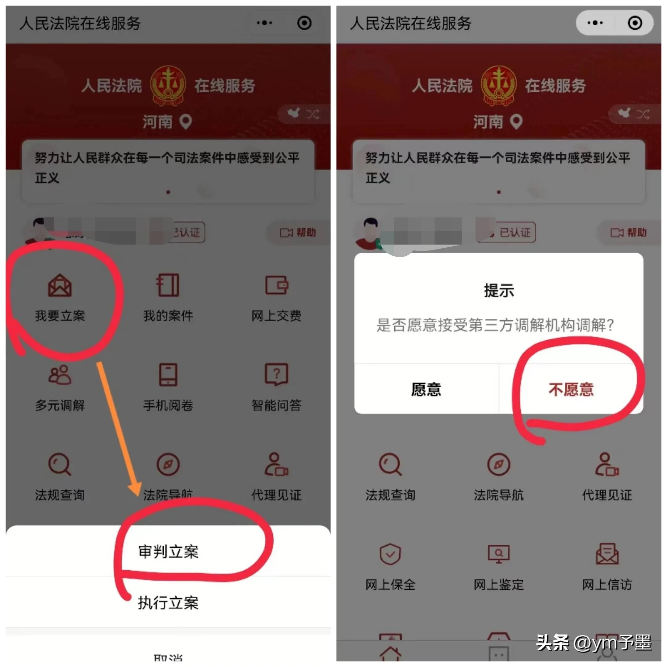 点击我要立案→审判立案 →不接受调解→为本人申请立案→选择管辖法院→案件类型为民事一审