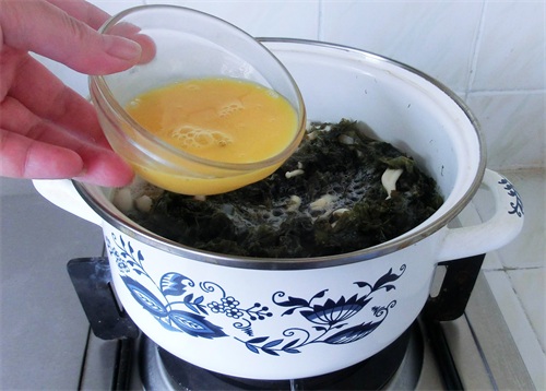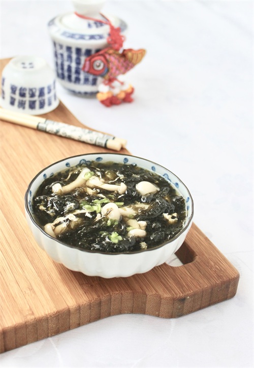 材料:紫菜5克、白玉菇200克、鸡蛋1个、青蒜末少许
