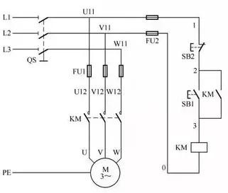 合上刀开关QS,按下启动开关SB,接触器(KM)线圈得电,接触器主触点吸合,电机得电开始动作,松开启动按钮,接触器线圈失电,接触器主触点复位,电机停止动作。
