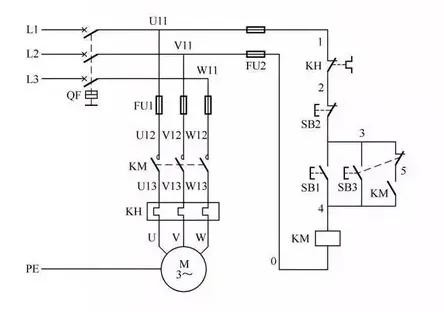 合上断路器QF,按下启动开关SB1,接触器线圈得电,接触器触点由常开变为常闭,此时即便松开启动开关SB1,电流还是会通过路径1—2—3—5—4流到接触器线圈,接触器自锁;