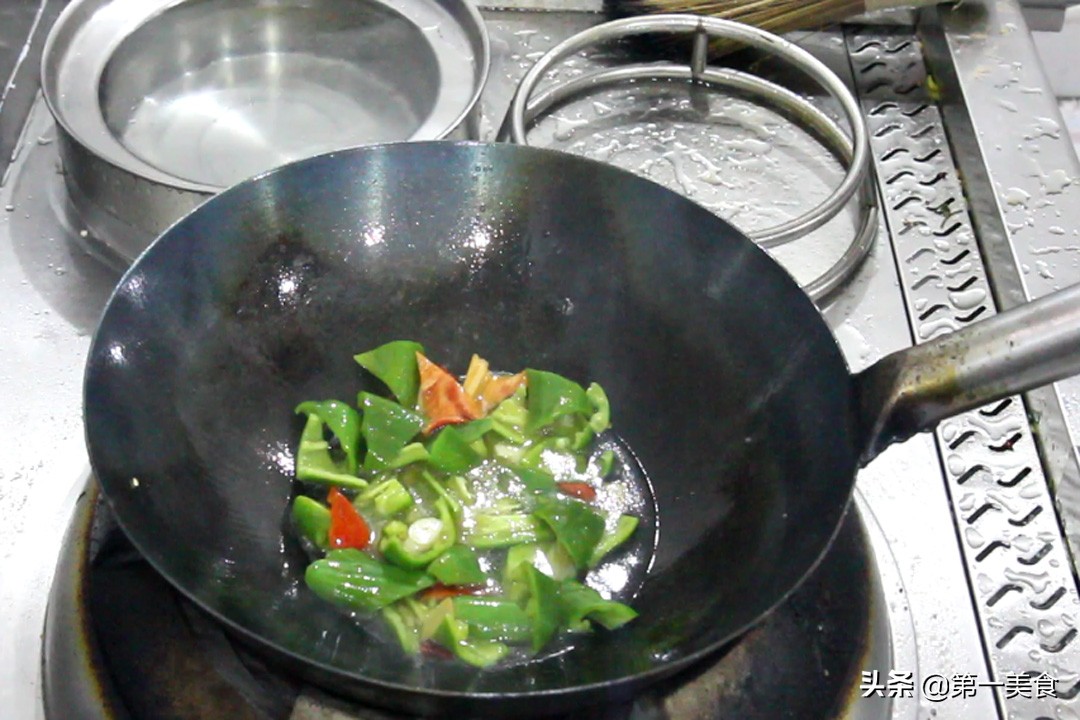 闻到大蒜的香味之后,倒入青椒、红椒,翻炒几下,加入一勺清水。