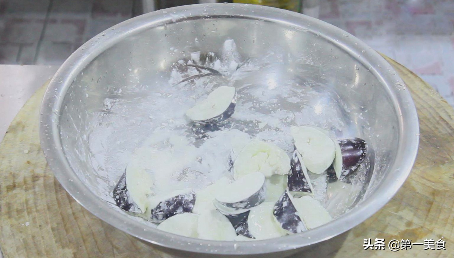 茄子从水中倒出,沥干水份,均匀的包裹上淀粉。
