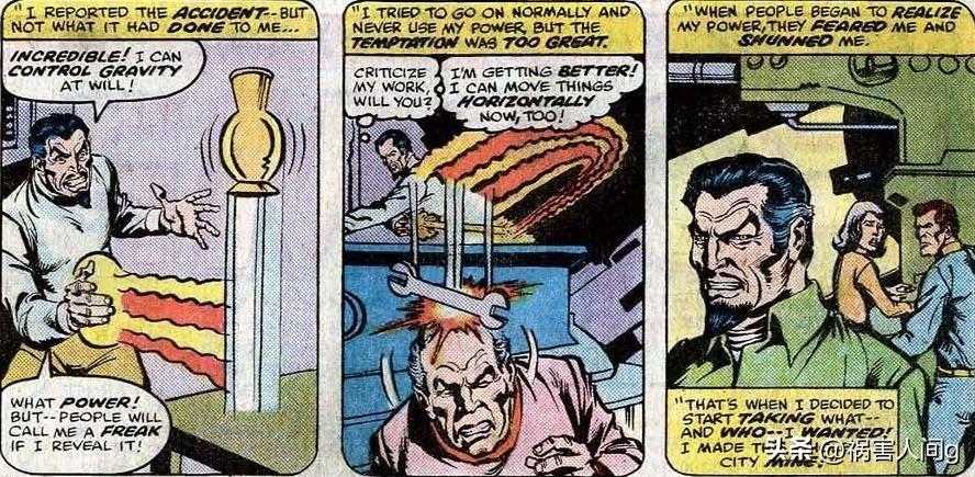 万力王本名富兰克林.霍尔,第一次登场于1977年漫画《复仇者》#158。万力王英文名为Graviton,直译为引力子,显示出了万力王的能力,万力王唯一的能力就是操纵引力子,由此衍生出飞行、力场屏障等众多能力。