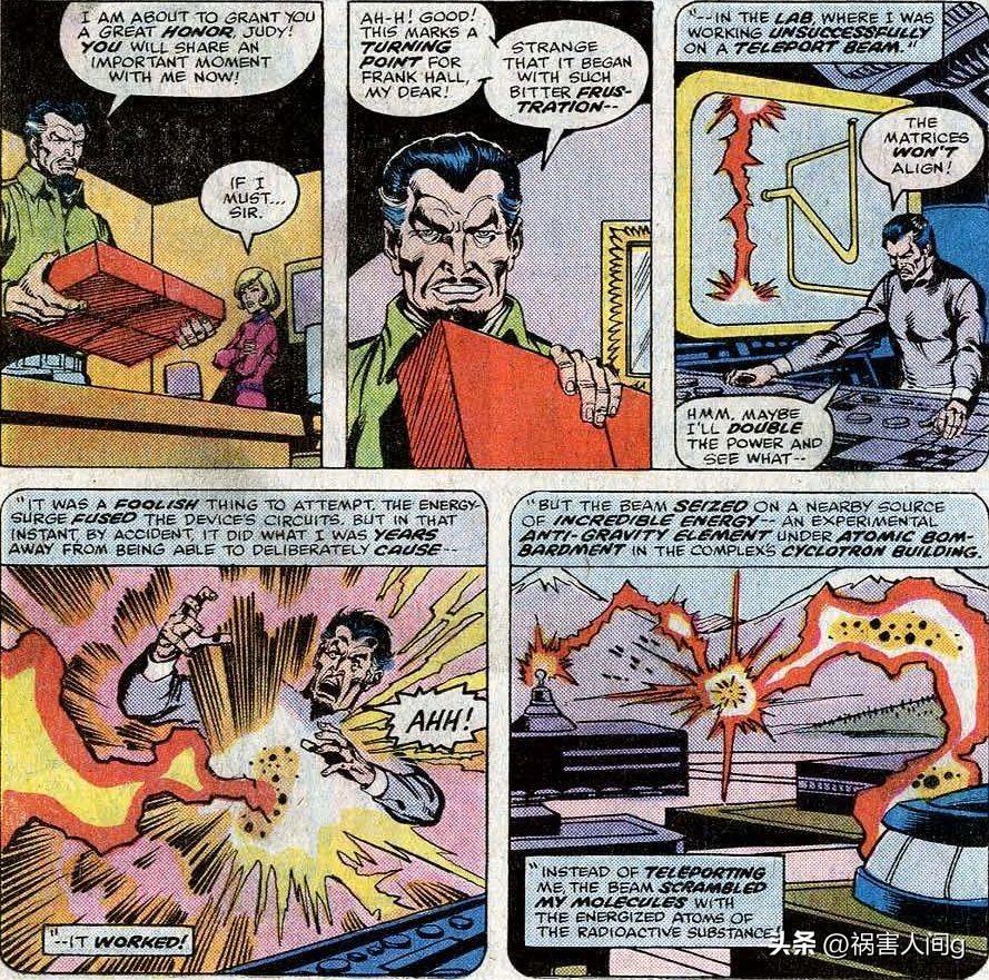在一次实验中,实验设备能量过载,发生了爆炸,将霍尔身体的分子与附近一台粒子加速器中产生的亚核引力子融合在一起。