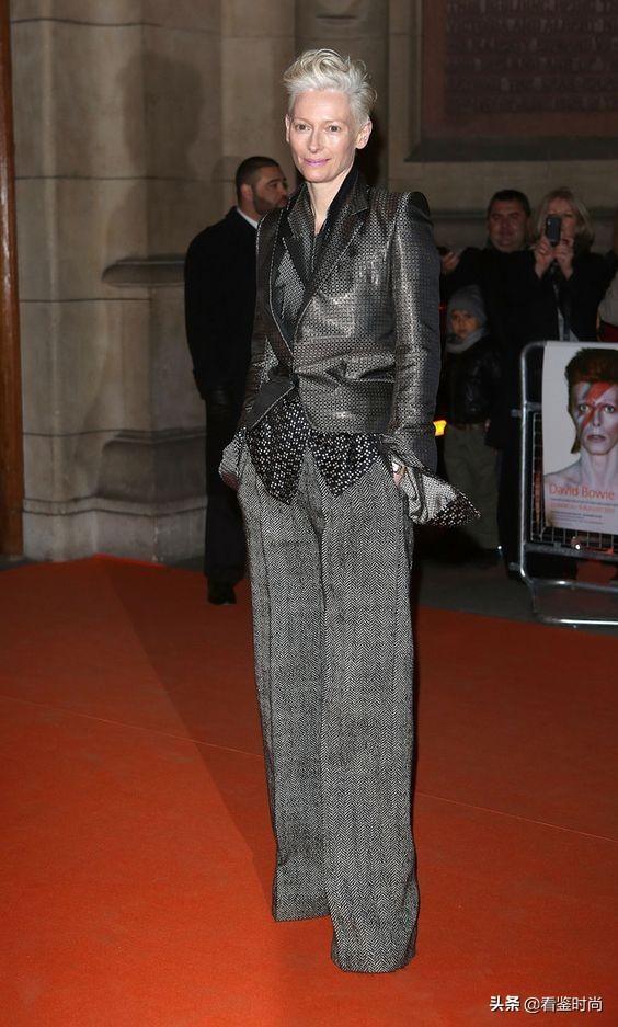 蒂尔达·斯文顿(Tilda swinton)也是大家熟知的国外女星,她今年已经60岁,短发造型很有气质。它的这身西装穿搭就是最好的典范,你只需要搭配一个精致的包袋就可以完成整体造型。