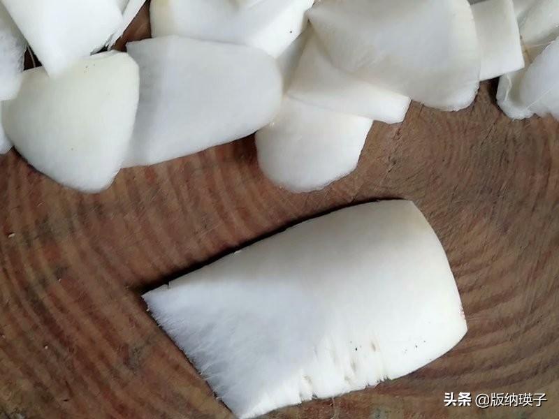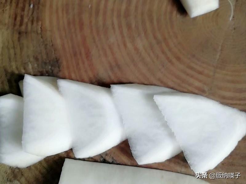 步骤一: 把洗干净的萝卜皮切成厚度在1cm左右的条状。