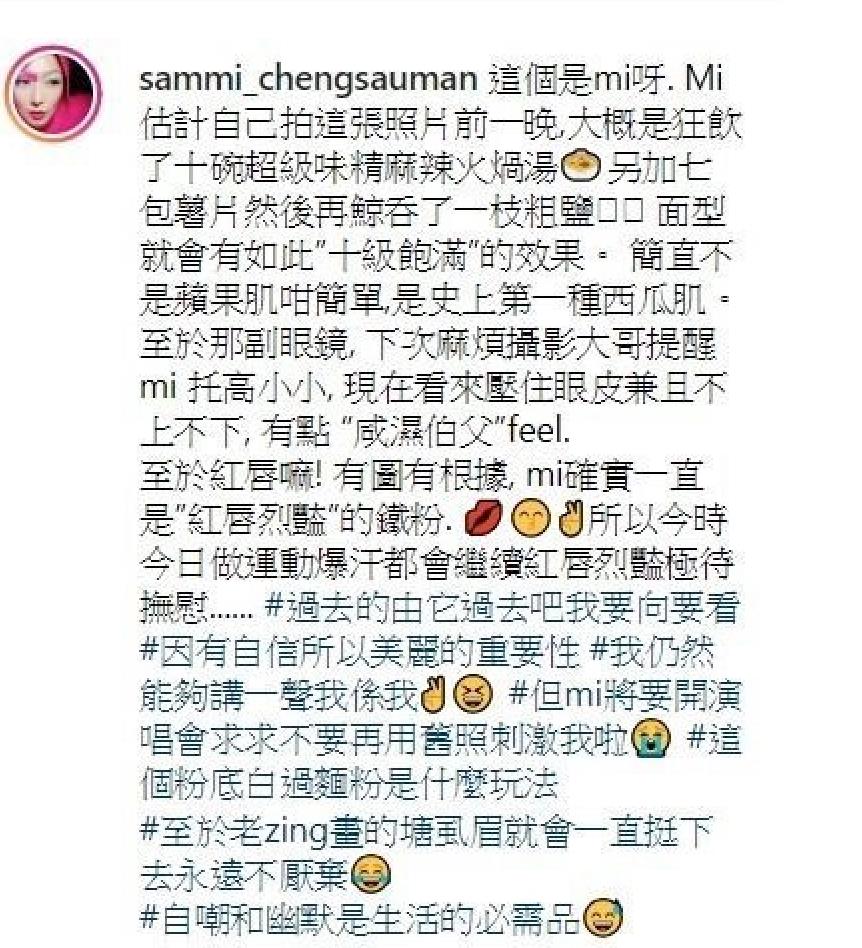 而在大家傻傻分不清到底是郑秀文还是杨千嬅的时候,郑秀文则是很坦然地回应这张照片中的人是自己,更有意思的是,她还不忘自嘲一番写下“这个是mi呀。Mi估计自己拍这张照片前一晚,大概是狂饮了十碗超级味精麻辣火锅汤,另加七包薯片然后再鲸吞了一枝粗盐,面型就会有如此‘十级饱满’的效果。简直不是苹果肌咁简单,是史上第一种西瓜肌。至于那副眼睛,下次麻烦摄影大哥提醒mi 托高小小,現在看来压住眼皮兼且不上不下,有点‘咸湿伯父’feel。”