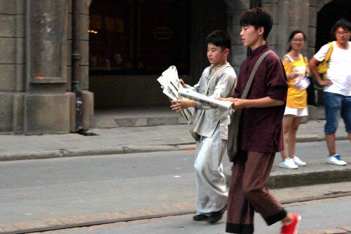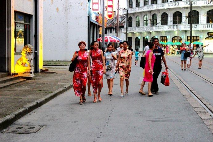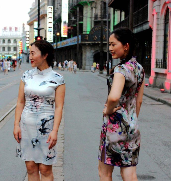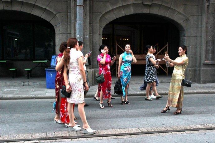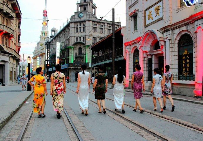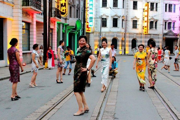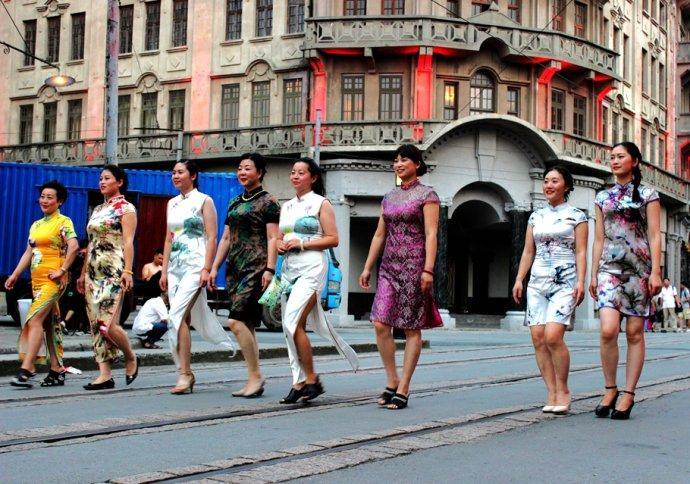 几位女士身着艳丽旗袍,在南京路步行街上嫣然走秀。旗袍光彩照人,形态婀娜多姿,着实吸引了不少路人。