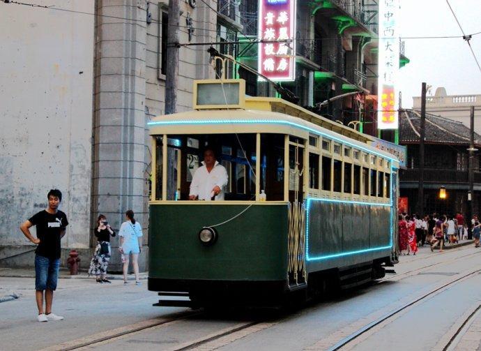 街上开始人头人头攒动,有轨电车、黄包车,身穿“老上海”年代的旗袍女士,若是街边小楼上再来点人声酒声和歌舞乐声,那可真的要怀疑是不是穿越了时空,夜游,还真是别有一番风味呢。