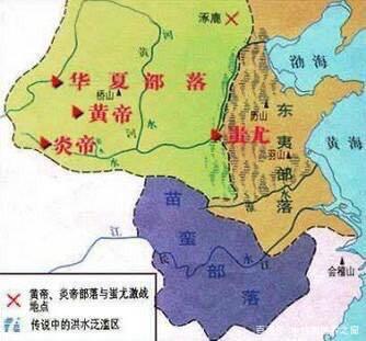 三苗的首领蚩尤以强大的军事力量取代了伏羲氏后人统治的东夷古国,蚩尤为首的三苗-东夷大集团势力大增,继续北上扩张,成为黄帝炎帝的一大威胁。三苗进犯炎帝集团百余年已经是家常便饭。蚩尤坐镇东夷也骚扰黄帝。最后炎帝不堪其扰,联合黄帝打败了蚩尤军队,蚩尤被黄帝杀死在逐鹿。蚩尤建立的东夷-三苗大集团瓦解。东夷纳入了黄帝势力范围,炎帝臣服黄帝。黄帝统一了华夏地区,成为华夏部落的大统领。