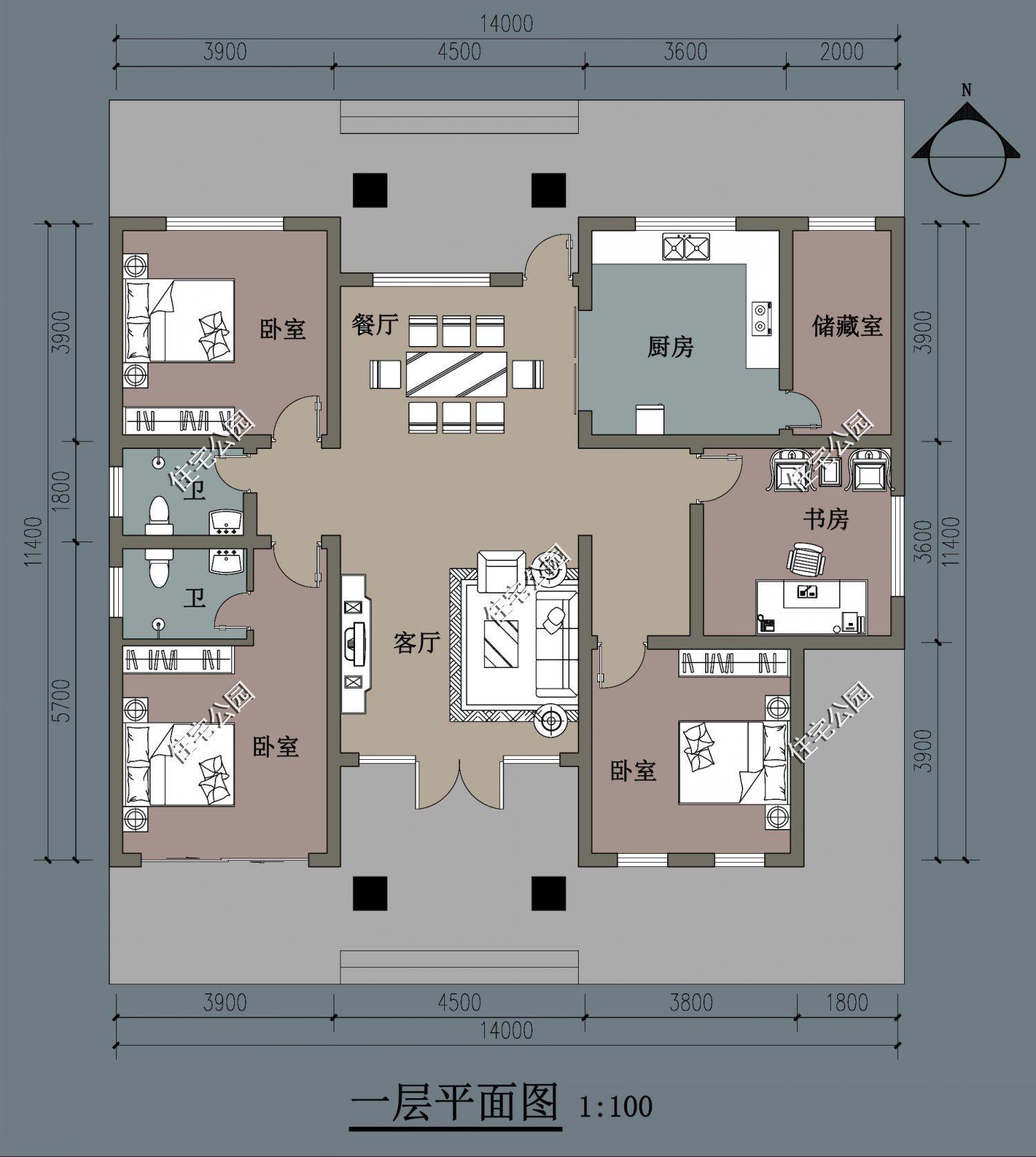 户型布局非常紧凑又通透,4个卧室分布四周,满足日常需要绝对没问题。客厅餐厅局中连成一条线,采光通风都非常好。专门设计了舒适外走廊,可以用来摆放农具。总而言之是一套非常完美的户型了。