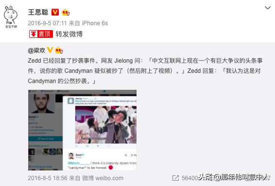早在16年的时候,大张伟疑似抄袭zedd的作品,就被王思聪揪出。王思聪还转发了一条微博说zedd回应了抄袭事件,说大张伟的歌曲就是对于candyman的公然抄袭。这条微博是2016年9月5日发的,一直被王思聪置顶到现在。现在进去还是看得到这条微博的。