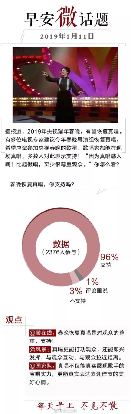 今日微话题【春晚恢复真唱,你支持吗?】据报道,2025年央视猪年春晚,有望恢复真唱。有多位电视专家建议今年春晚导演组恢复真唱,希望应邀参加央视春晚的歌星、歌唱家都能在现场真唱。多数人对此表示支持!“因为真唱感人啊!比起假唱,至少很尊重观众。”