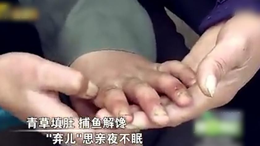当主持人牵起杨六斤常年挖野菜的手时,指甲里的绿色早已深深渗透在皮肤里,洗刷不掉。周围还遍布着伤疤,这些都是他在做饭时受的伤。这些痕迹都在昭示着这个孩子这些年所遭受的苦难。