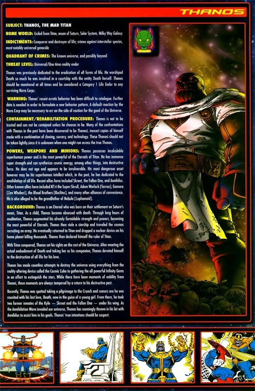 他被新星军团分类为1级生命终结者,具有“普遍”威胁级别,并且曾是一次性现实终结者。