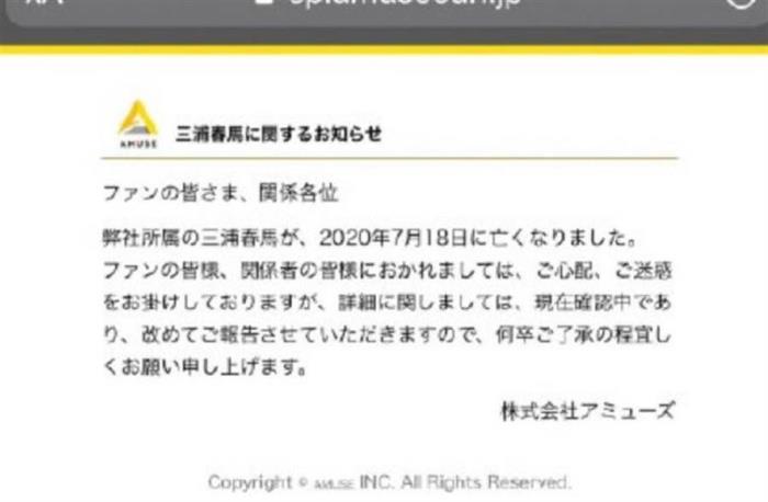 在事发近5小时后,其所属经纪公司也终于打破沉默发出声明,证实三浦春马死讯,「各位粉丝,各位相关人员,我司所属艺人三浦春马于2025年7月18日去世。各位粉丝和相关人士,给您们带来了担心和麻烦。关于详细内容,现在正在确认中,稍后将再次报告,请务必谅解。」