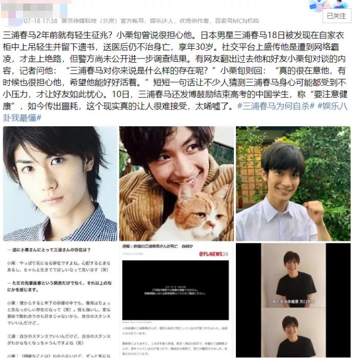 7月18日,日本知名男星三浦春马被曝在家中上吊轻生,享年30岁,消息一经曝光,无数网友震惊不已。