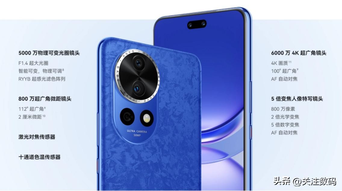 华为Nova12Pro后摄为5000万物理可变光圈镜头加800万超广角微距镜头,前置6000万超广角镜头加800万人像特写镜头。