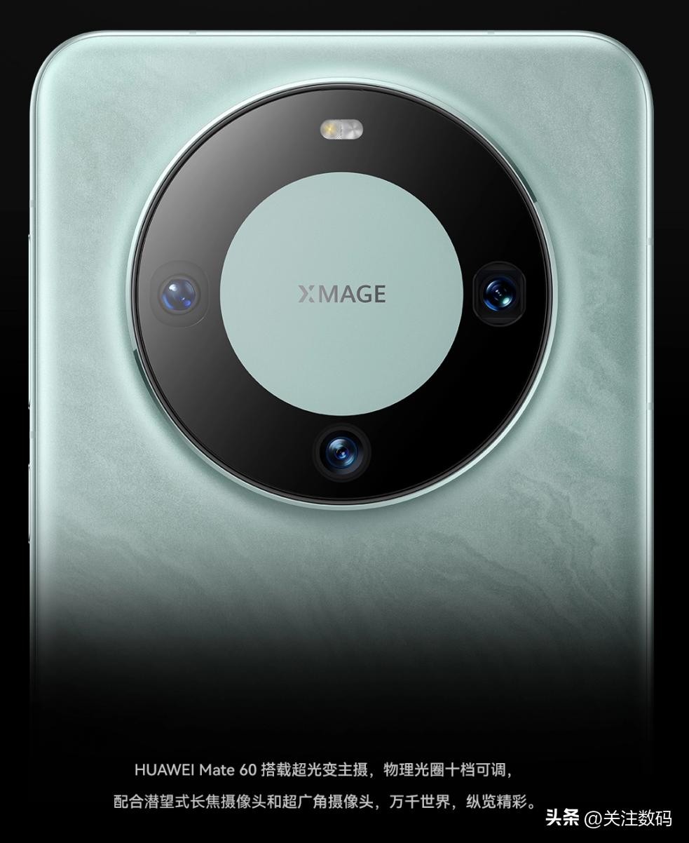华为Mate60 搭载超光变主摄,物理光圈十档可调,包括 5000 万像素超光变摄像头、1200 万像素超广角和1200万像素潜望式长焦摄像头,支持OIS光学防抖。前置1300万像素超广角摄像头。