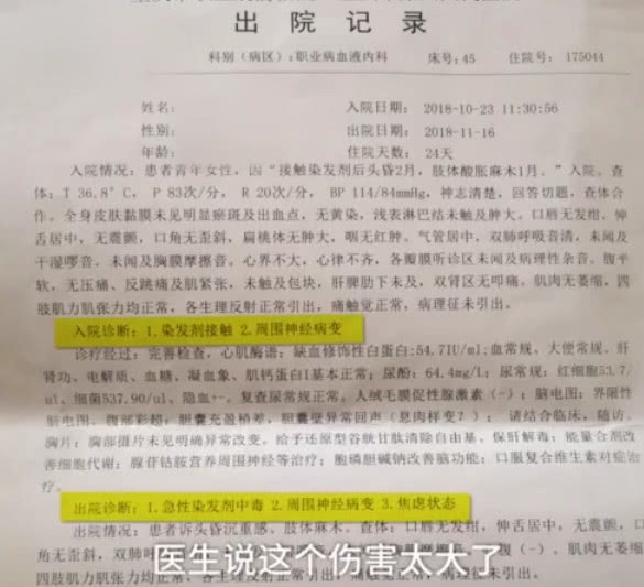 女子说到现在自己四肢都是麻木并且头昏眼花。医院为女子诊断出来为中毒性脑瘤,医生说女子用的染发剂伤害太大了,并且这个东西毒性含量太高了。之所以用完染发剂开始一直脱发就是损伤后造成的后遗症。