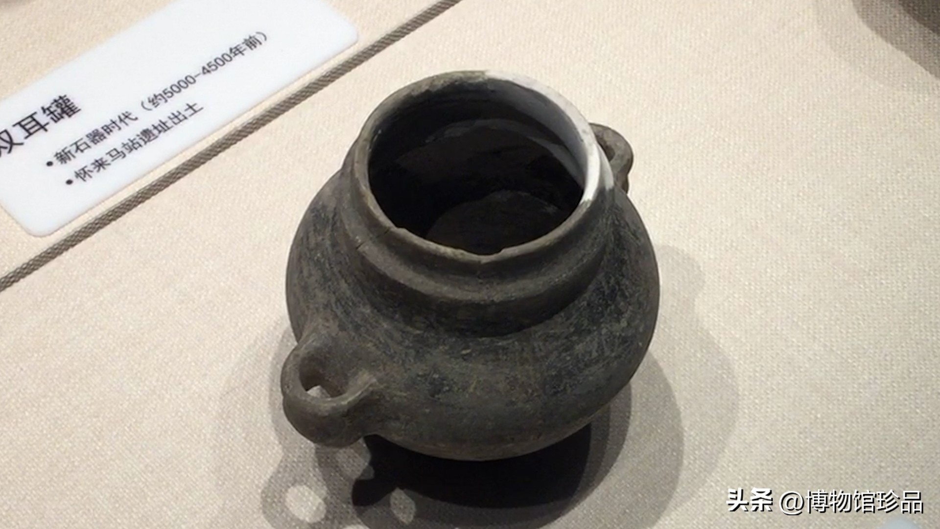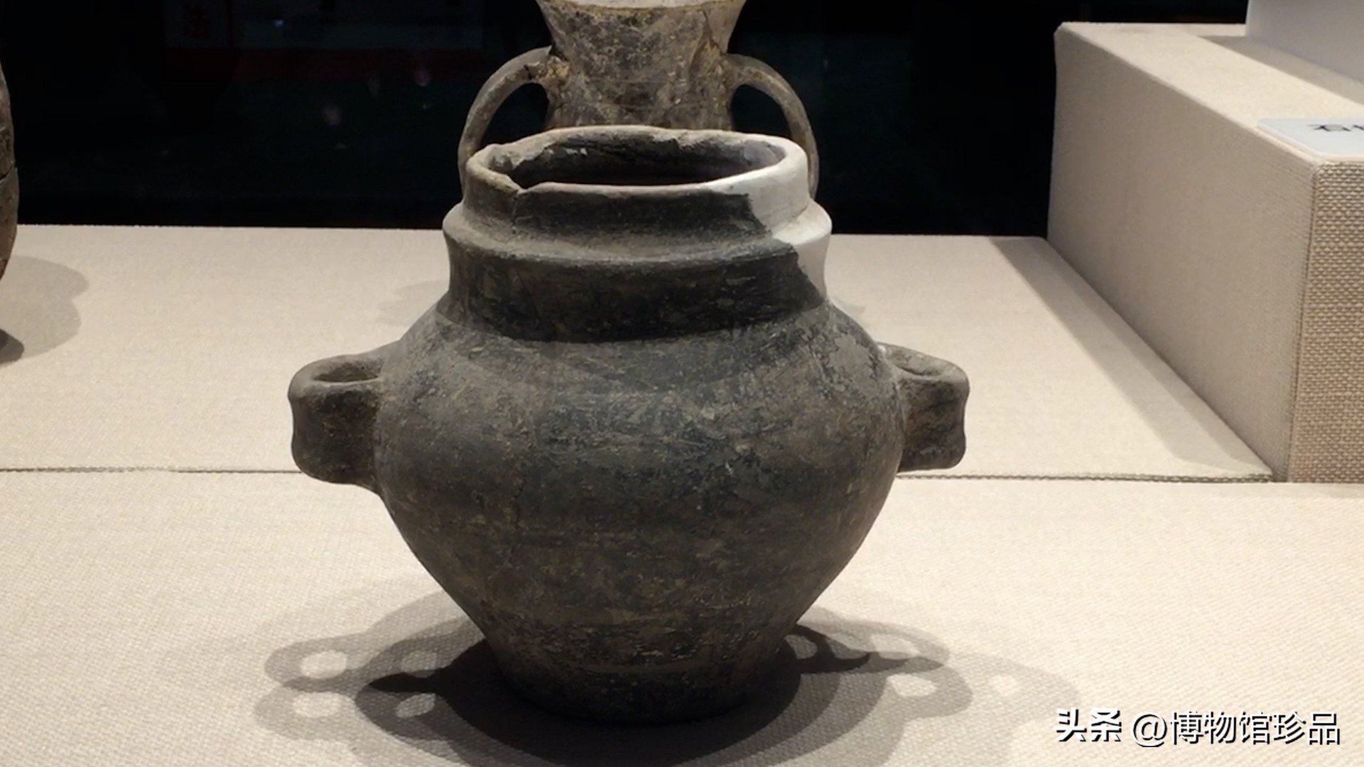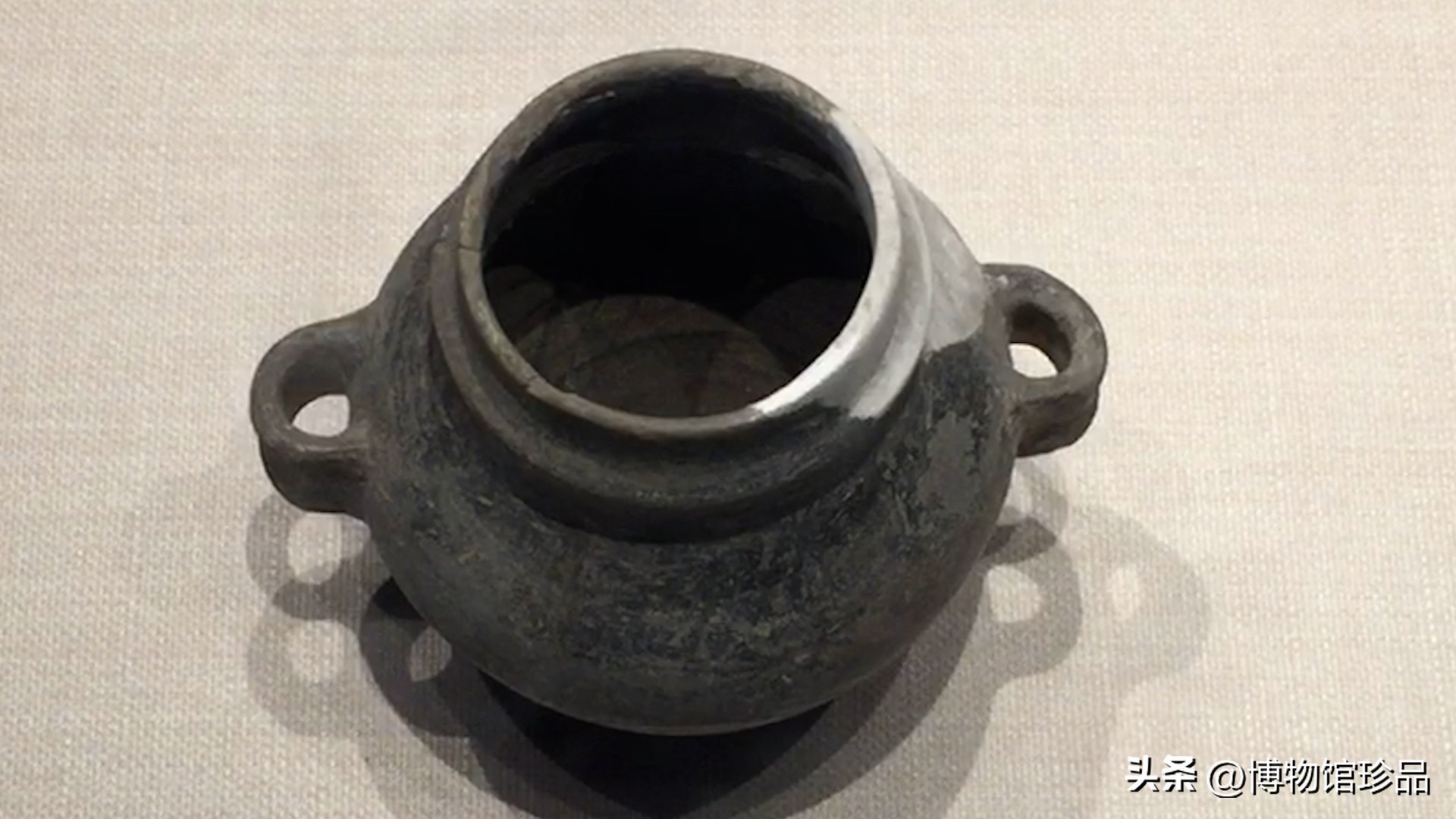 这件距今三千多年的双耳敛口罐,是一件灰陶器。罐子的口是敛口,颈短而且直,罐子的腹是鼓腹,肩部塑有环状双耳。
