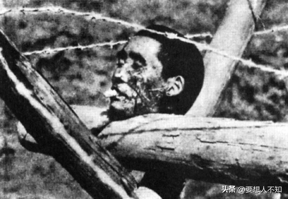 这张照片,中国人的头被挂在铁丝防御网上,这应该是个士兵,他嘴里还有根烟头,明显被人取乐过的。