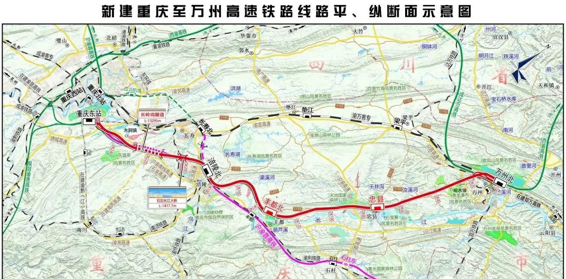 渝万高铁始于重庆东站,途径涪陵北站、丰都北站、忠县站、止于万州北站。该线路新建正线约251公里,总投资约523.5亿元,建设总工期为4.5年,计划2026年开通运营。