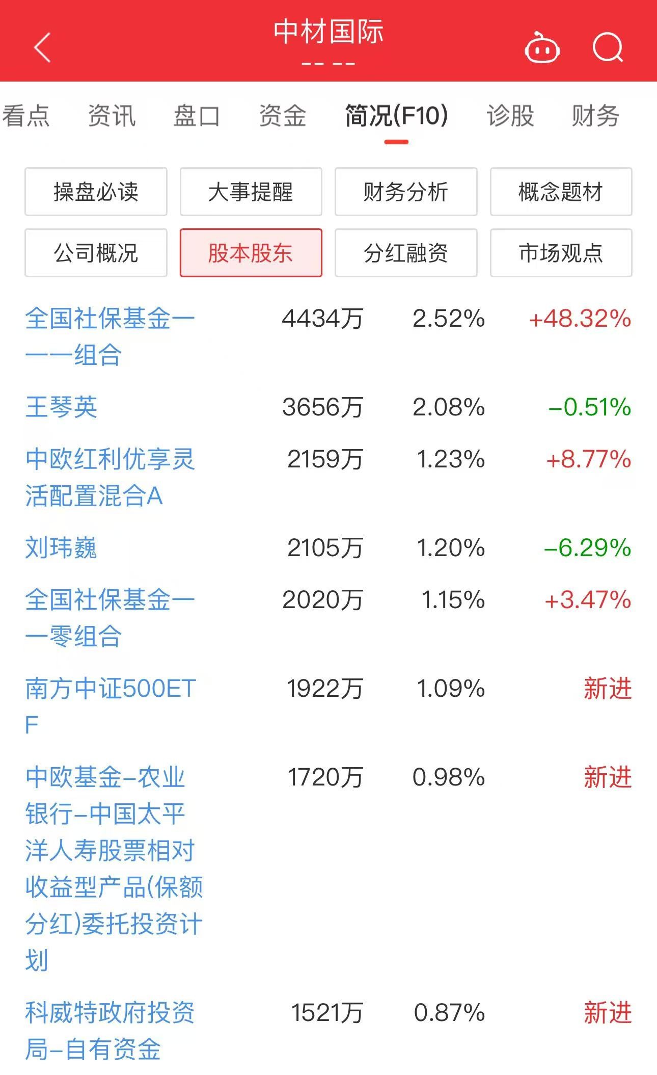国家队持仓方面,中材国际最近被社保基金重仓买进6454万股,占比超50%。