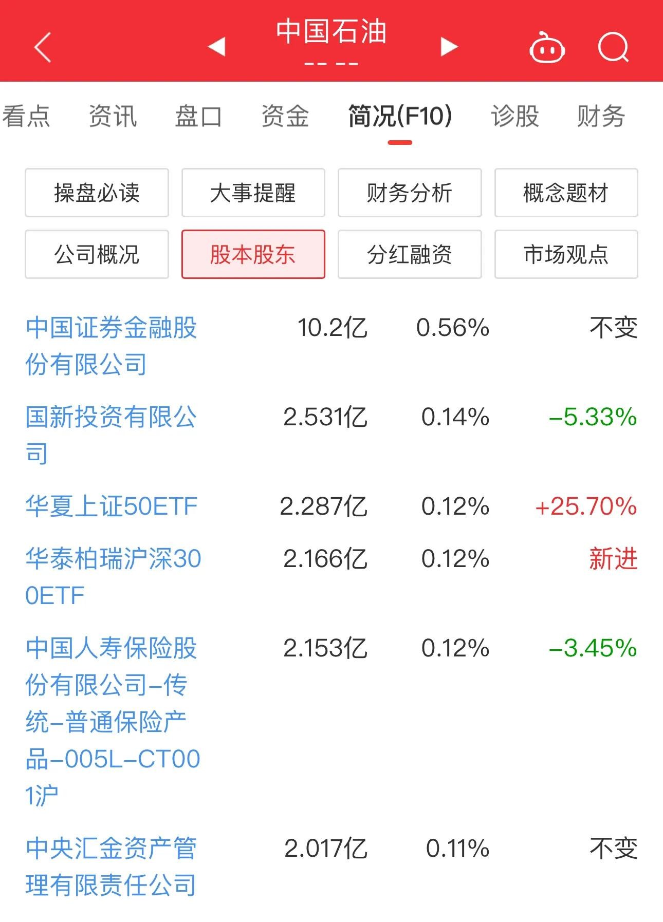 国家队持仓方面,中国石油被中央汇金、证金公司分别持股 2.017 亿、10.2 亿。