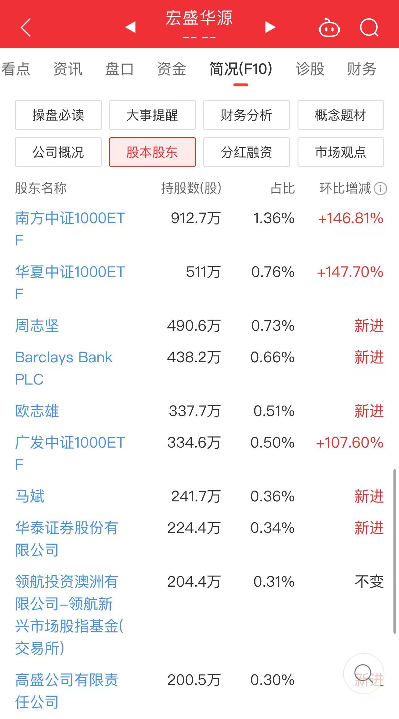 股东方面,宏盛华源近期被巴克莱、高盛等外资重仓买进,分别持股438.2万、200.5万。