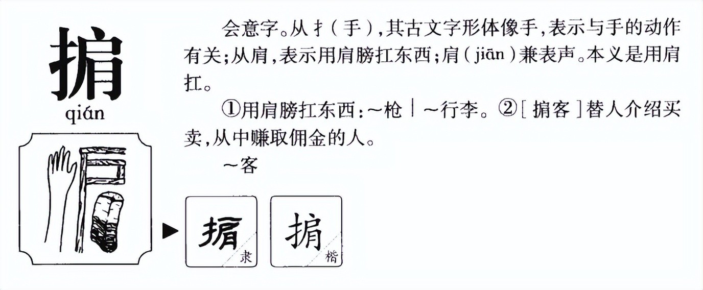 "掮"字的本义,表示以肩举物。甲骨文中,上面是一个"刀"形,表示利器;下面像个人形,双手向上托物,整体表示用双手或肩膀扛着东西走路。