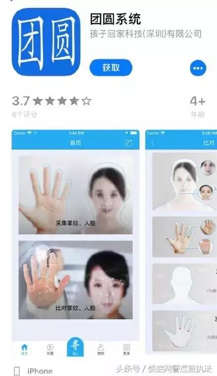 这款软件的介绍称,“团圆系统”是一款寻找丢失和被拐卖人口的公益软件,通过采集用户的人脸、掌纹等信息,帮助用户寻找失散的亲人。