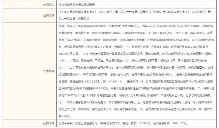 处罚事实显示,当事人(北京麦思甜食品有限公司)在其经营场所经营招牌为“巴黎贝甜”的加盟餐饮店。该门店在4月5日至7月17日期间,经营标注虚假生产日期的食品,货值金额合计4202.12元,违法所得1091.82元。此外,据当事人提供的7月1日至12日每日消毒管理登记表,消毒执行人未实际执行消毒操作(早晚两班只上一班,记录了两班的消毒执行),当事人接触直接入口食品的盘子、夹子使用前未经消毒。