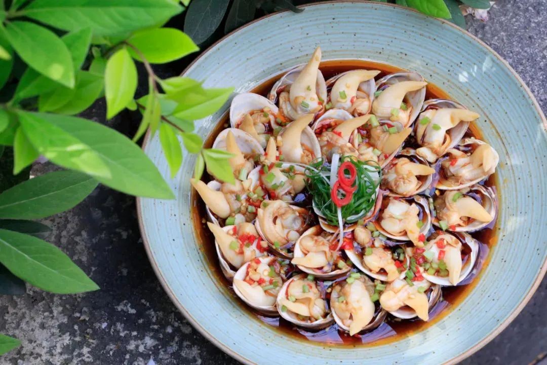 1. 黄蚬泡水吐沙冲洗干净,汆熟接冰水,去半壳待用;