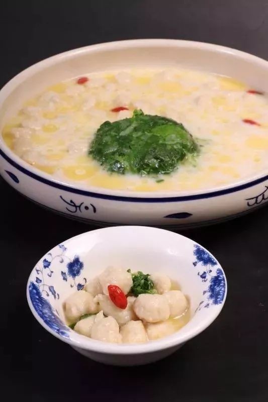 这道菜之所以热销,主要是因为这四个亮点:首先,选用鲅鱼肉制作丸子,口味鲜嫩,比猪肉丸更上档次。其次,鱼丸挤得似玻璃珠一般大,个头小巧,入汤后漂浮在上层。再次,鱼丸入热水低温浸熟,口感细嫩无蜂窝。最后,高汤内调入三花淡奶、淋上金瓜鸡油,再搭配汆水的奶白菜,黄绿相间,荤素有致。