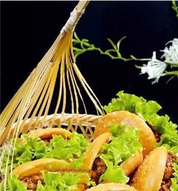 3.出菜时,将蒸好的小饼入200℃的油温中炸成金黄色捞出,夹生菜和炒好的酱肉即可。