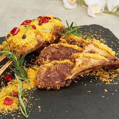 3. 将煎好的羊排用避风塘料拌匀,抹匀羊排表面,再用锡纸包好肋排周边;