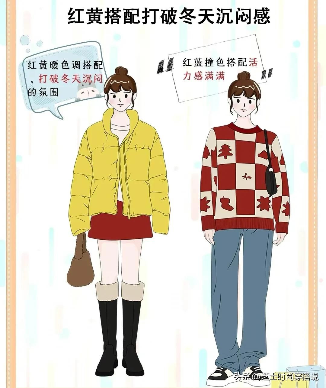 红色搭配黄色,选择浅黄色最适宜,可以尝试一件黄色的毛衣搭配红色围巾,过年期间作为内搭,番茄炒蛋的配色,元气满满,非常治愈。