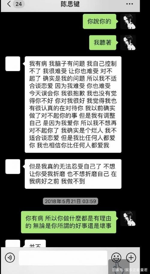 近日,有网友曝光odd陈思键恋爱期间出轨的事情,还爆出了多段聊天记录。据该网友称,在和陈思键恋爱期间,陈思键多次以自己有病这一说法,来为他自己出轨的所作所为找各种借口。