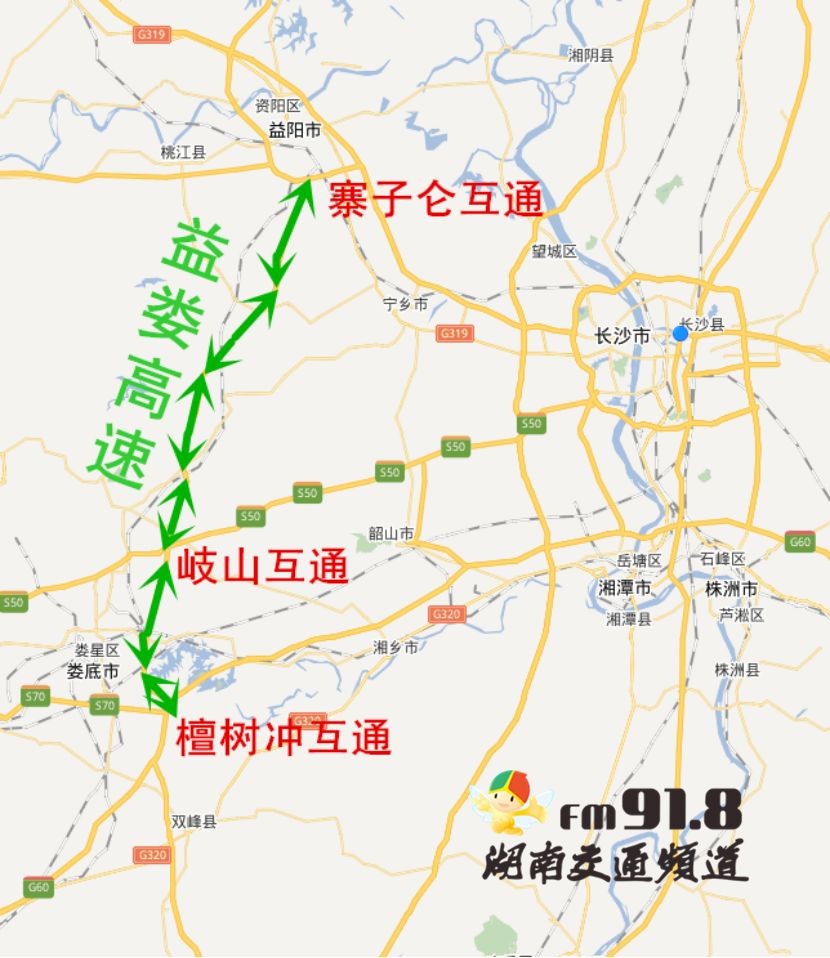 从广东和湘中、湘南地区前往益阳、常德方向的车辆,可在S50长韶娄高速的岐山枢纽转S71益娄衡高速北向通行,直达S7101益阳绕城高速,可有效避开长益高速、京港澳高速等大流量路段。