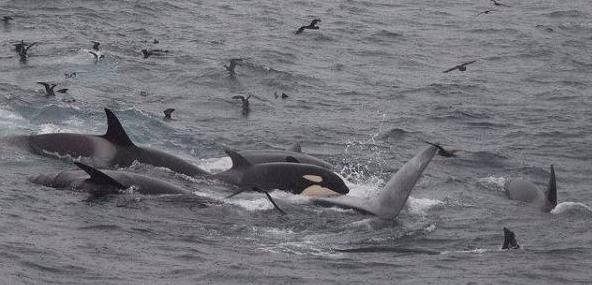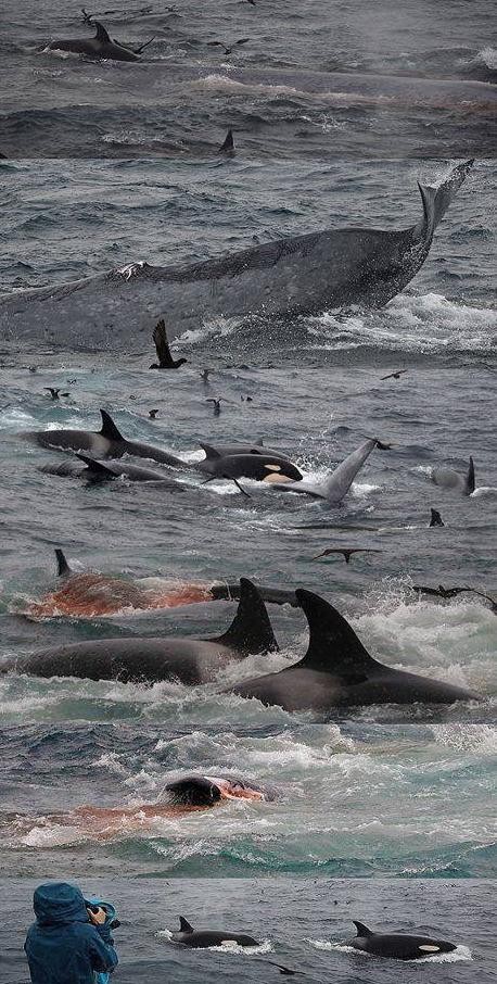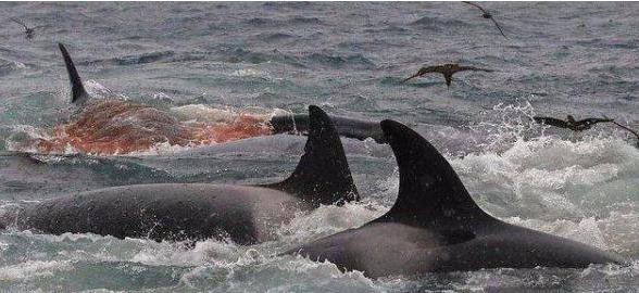 澳大利亚的海洋生物学家,近日在西澳近海目睹6头杀人鲸(Killer whale,Orca,又称:虎鲸)围攻一头18米长的蓝鲸,海水全被蓝鲸的血染红,不久后更冒出50头杀人鲸,一起瓜分享用蓝鲸肉。